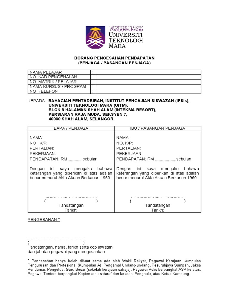 Borang Pengesahan Pendapatan Uitm Kosong Pdf